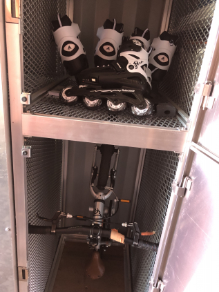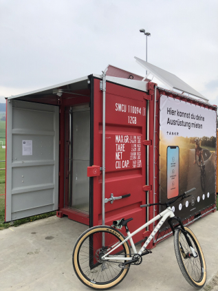 Der Pumptrack verfügt über eine Mietstation von Tankr. Die Mietstation funktioniert wie ein elektronisches Schliessfach und beinhaltet alles an Ausrüstung, was du für deinen Besuch auf dem Pumptrack benötigst. Mittels App lässt sich sämtliches Sportmaterial reservieren oder direkt buchen. Auch die Mietstation lässt sich - nach Reservation - ganz easy mit deinem Smartphone öffnen.